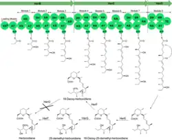 Biosynthesis of herboxidiene has been studied for over 20 years since its discovery. The precursor of herboxidiene, 18-deoxy-25-demethyl herboxitriene was first synthesized in Streptomyces chromofuscus through a nine-modules PKS I pathway. 18-Deoxy-25-demethyl herboxitriene is then epoxidized by enzyme HerE on the carbon carbon double bond between C14 and C15, oxidized by enzyme HerG on C-18 and eventually methylated by enzyme HerF on C25 to herboxidiene with the help of cofactor S-adenosyl methionine (SAM).[5]