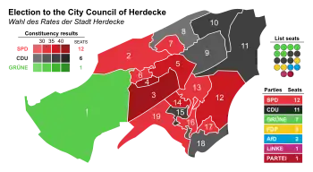 The Herdecke city council governs the city alongside the Mayor. The most recent city council election was held on 13 September 2020, and the results were as follows: