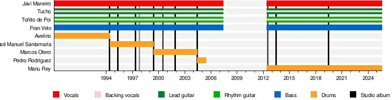 | Members | Singer: Francisco Javier Vázquez Maneiro Jarfuxo, O Fillo da necha Main guitar: Antonio Novo Suárez, Tuchiño. Second guitar:Antonio Ageitos Ares Tonhito de Poi Bass: Francisco Javier Velo Cambeiro O Jran Fran Drum: Avelino (1991–1994) José Manuel Santamaría Medín (1994–1999) Marcos Otero (1999–2004) Pedro Rodríguez Trelles (2004–2005) |