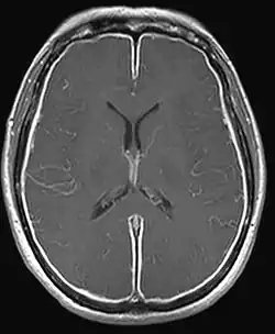 | T1W MRI of the brain demonstrating leptomeningeal enhancement consistent with meningitis | |