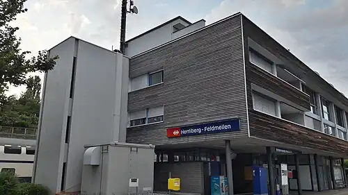 Herrliberg-Feldmeilen is a railway station in Switzerland, situated near the eastern bank of Lake Zurich (Goldcoast). The station is located adjacent to the village of Feldmeilen in the municipality of Meilen but, as its name suggests, also serves the adjacent municipality of Herrliberg.[3] The station is on the Lake Zurich right bank railway line,[4] within fare zone 141 of the Zürcher Verkehrsverbund (ZVV).[2]