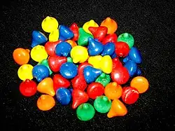 The basic colors were red, orange, yellow, green and blue. Holiday versions were also made in pastels for Easter, pink and white for Valentines, and red and green for Christmas. In mid-2007, Hershey's introduced a dark chocolate version called Kissables Dark, which featured more subdued colors and a semi-sweet interior.