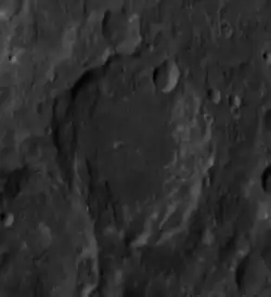 This is a somewhat worn crater formation with a wide inner wall. There is a pear-shaped crater along the northern inner wall. The interior floor is relatively featureless, with only a small ridge offset to the southwest of the midpoint.