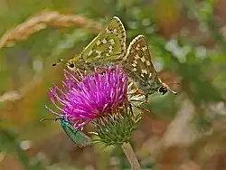 Hesperia, the branded skippers, is a Holarctic genus in the skippers (Hesperiidae) butterfly family. Most species are endemic to North America, Hesperia comma is widespread throughout the region. H. florinda is endemic to temperate eastern Asia. H. nabokovi is endemic to Hispaniola.