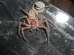 Heteropoda cervina shelters under bark or other dark places during the day, emerging in the evening to find prey, often on tree trunks. These spiders are also known to enter houses, though they are extremely timid, and their bite โ€“ while painful โ€“ is only mildly toxic.[3] Their unequally sized legs, after which the genus is named, are splayed to the side allowing very fast sideways movement and abrupt change of direction. They have strong, curved fangs, a flattened body and two rows of four eyes. Males and females look alike, females larger. Females lay their eggs in large "cocoons". Heteropoda cervina is very similar in appearance to the related species Heteropoda jugulans. There has been a great deal of confusion regarding this species, because of a misidentification of Heteropoda jugulans as Heteropoda cervina by Ramon Mascord (1970, 1980) perpetuated by other authors.[2][4]