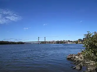 Hexham is located just upstream of the Hunter River delta and its various islands, and as such it was a relatively convenient place for crossing to the north bank of the river. A punt was established in the 1800s, followed by a steam punt, which eventually carried motor traffic. As traffic levels grew after World War I, Hexham became a bottleneck for road traffic. A decision was made in the late 1930s to construct a bridge, however construction was delayed by World War II. Eventually the first two-lane bridge was opened in December 1952.[10][11] The first bridge is a steel truss bridge with a central lifting span, designed to allow shipping to travel upstream. By the 1970s, this bridge was becoming a bottleneck and the decision was made to increase capacity by building a second bridge for all northbound traffic. This concrete high-level fixed bridge was built just upstream of the original bridge (converted to carry southbound traffic only) and was opened in August 1987.[12][13]