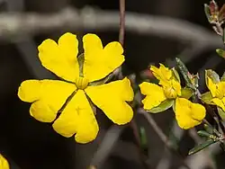 Hibbertia ancistrotricha is a shrub that grows to a height of 0.3–1.3 m (1 ft 0 in – 4 ft 3 in). Its leaves are spirally arranged, narrow oblong to linear, 2.5–8 mm (0.098–0.315 in) long and 0.8–1.2 mm (0.031–0.047 in) wide on a petiole up to 0.5 mm (0.020 in) long, with the edges turned downwards. The flowers are arranged singly in leaf axils and are 8–15 mm (0.31–0.59 in) in diameter, on a peduncle 2–8 mm (0.079–0.315 in) long with narrow triangular, leaf-like bracts 1.5–2.5 mm (0.059–0.098 in) long. The five sepals are tinged with red, 4–5 mm (0.16–0.20 in) long, the outer sepals 1.8–2.5 mm (0.071–0.098 in) wide and the inner ones about 3 mm (0.12 in) wide. The five petals are bright yellow, egg-shaped with the narrower end towards the base and 4–7 mm (0.16–0.28 in) long with a notch at the tip. There are usually ten stamens, fused at the base and on one side of the two carpels that each contain four ovules. Flowering mainly occurs from September to November.[2][3]
