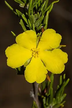 Hibbertia crispula, commonly known as Ooldea guinea flower,[2] is a species of flowering plant in the family Dilleniaceae and is native to disjunct locations in Western Australia and South Australia. It is a small, wiry, glabrous shrub with needle-shaped leaves and yellow flowers with twenty-five to thirty-five stamens arranged around three glabrous carpels.