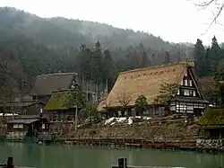 Hida Folk Village, Hida no Sato (飛騨民俗村, 飛騨の里, Hida Minzoku Mura, Hida no Sato) is an open-air museum of close to 30 old farmhouses illustrating the traditional architectural styles of the mountainous regions of Japan. Of particular interest are the thatched and shingled roofs, such as the gasshō-zukuri-styled buildings. Many of the buildings were brought from their original sites to preserve them. The village is picturesquely situated on a hillside overlooking the Takayama Valley and surrounding a large pond. It is in the city of Takayama, Gifu Prefecture, Japan, about 2.5 km (1.6 mi) southwest of the train station.