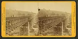 The first bridge at the site was built by the Philadelphia and Columbia Railroad in 1832. It was a single-track wood span on stone piers. The bridge was widened to double-track in 1854.[3] This bridge was replaced by a cast iron bridge in 1867, and that in turn by a wrought iron Pratt truss in 1890.[4] By around the start of the 20th century, however, the double-track bridge was proving to be a bottleneck in the quadruple-track main line on both sides, and plans were made for a bridge that would carry four tracks across the Brandywine Valley.[5]