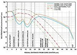 HFIR is a beryllium-reflected, light-water-cooled and -moderated, flux-trap type reactor that uses highly enriched uranium fuel.[3] The preliminary conceptual design of the reactor was based on the "flux trap" principle, where the reactor core consists of an annular region of fuel surrounding an unfueled moderating region or "island". Such configuration permits fast neutrons leaking from the fuel to be moderated in the island and so gives a region of very high thermal-neutron flux at the center of the island. This reservoir of thermalized neutrons is "trapped" within the reactor, making it available for isotope production. The large flux of neutrons in the reflector outside the fuel of such a reactor may be tapped by extending empty "beam" tubes into the reflector, allowing neutrons to be beamed into experiments outside the reactor shielding. A variety of holes in the reflector may be provided in which to irradiate materials for experiments or isotope production.