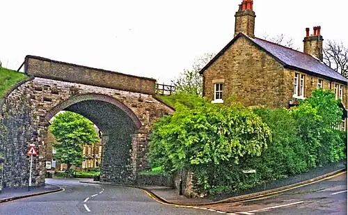 On leaving its bay at Buxton LNWR station, the line turned through a tight 180-degree curve southwards across a thirteen-arch skew viaduct 87 feet (27 m) high over the Midland line and Spring Gardens, with an uphill gradient of 1 in 62 (16.1 ). The station was located next to Clifton Road, and between it and Dale Road was an extensive goods yard which had been opened in 1891 as part of the scheme to link Buxton with High Peak Junction near Cromford. Like all the stations on the line the platforms and buildings were of timber construction.
