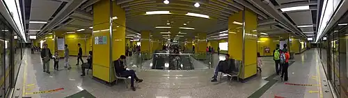 The transfer between Lines 4 and 7 uses node transfer, accessible by stairs and escalators. Before the opening of Line 7, the two paid areas of Line 4 could not be connected because the station only opened a non-paid area passage between the two concourses. At that time, notices were placed in front of the entrance to remind passengers of the direction of travel. If a passenger accidentally chooses to enter the station in the wrong paid area, he or she can only seek help from the station staff and go to the other concourse through the non-paid area passage or take a train to the next station before switching to the right direction.[7] After the opening of Line 7, the concourses are connected through the paid area via the Line 7 platform.