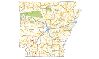 Arkansas Highway 19 (AR 19) is a designation for two state highways in South Arkansas. One segment of 18.05 miles (29.05 km) runs from the Louisiana state line north to U.S. Route 79B (US 79B) in Magnolia.[2] A second segment of 24.73 miles (39.80 km) runs north from US 371 north across Interstate 30 (I-30) to Narrows Dam at Lake Greeson.[3][4]
