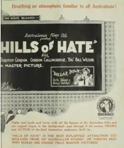 Hills of Hate is a 1926 Australian silent film directed by Raymond Longford, based on the debut novel of a similar name by E. V. Timms, who also wrote the screenplay. It is considered a lost film.