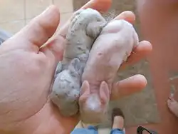 The Himalayan rabbit is a small breed of rabbit with similar markings to the Californian rabbit.[1] The body is white with colored points, recognized colors are black, blue, chocolate, and lilac.