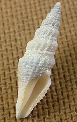 The acuminately turreted shell is yellowish white, sometimes stained with brown. The whorls are decussated with nodulous longitudinal ridges and spiral striae. The upper part of the whorls are concave, edged with a slightly nodulous keel.[2]