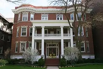 Hinman Apartments is a historic apartment building at 1629-1631 Hinman Avenue in Evanston, Illinois. Built in 1904, the three-story brick building has six apartments. Architects Atchison & Edbrooke, who also designed Evanston's Ridgewood Apartments, designed the building in the Classical Revival style. The building's design includes a two-story portico supported by Ionic columns, bow windows on either side of the portico, and a dentillated cornice and parapet. The apartments are arranged in a railroad plan, with rooms arranged along a long central hallway; while this layout was often associated with cheap apartments, the Hinman still targeted upper-class residents with its design and amenities.[2][3]