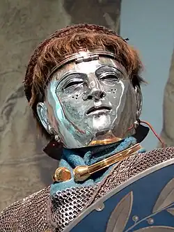 Substantial archaeological evidence has been found of such "sports equipment", as it has been dubbed. A hoard of cavalry display armour dating to the 3rd century AD was discovered at Straubing in Bavaria in 1950. It included extraordinarily elaborate horse armour, greaves, helmets and other pieces of armour.[5] Many more "sports helmets" have been recovered from other locations. They were made from a variety of metals and alloys, often from gold-coloured alloys or iron covered with tin. They were decorated with embossed reliefs and engravings depicting the war god Mars and other divine and semi-divine figures associated with the military. One of the Newstead Helmets from Scotland, for instance, is embossed with a naked winged figure of Cupid driving a chariot.[7]