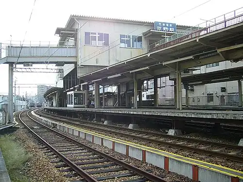 The station consists of one side platform and one island platform, connected by an elevated station building. The station is staffed.