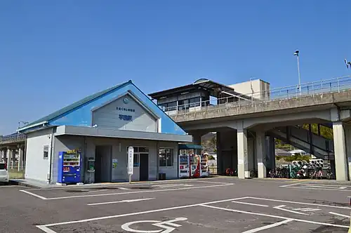 The station consists of a side platform serving a single elevated track. The station building, which has been built at the base of the elevated structure, is unstaffed and serves only as a waiting room. Access to the platform is by means of a flight of steps and an elevator. An enclosed shelter is provided on the platform for waiting passengers. Parking for cars is available at the station forecourt.[2][5]