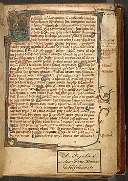 The Historia compendiosa is mostly an abridged version of Geoffrey of Monmouth's Historia regum Britanniae with some additions from the work of Ralph of Diceto.[1] The author also refers to a source as haec Brome (or Bream) or de compendio Brome in passages drawn from Geoffrey.[1][2] This was taken by John Bale and Thomas Tanner to refer to a historical compilation by a certain "Bromus", identified with John Bramis, a 14th-century friar who translated the Roman de Waldef. It is more likely that it refers to an earlier abridgement of Geoffrey of Monmouth.[2]