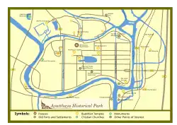 Ayutthaya Historical Park (Thai: อุทยานประวัติศาสตร์พระนครศรีอยุธยา (Pronunciation)) covers the ruins of the old city of Ayutthaya, Phra Nakhon Si Ayutthaya province, Thailand. The city of Ayutthaya was founded by King Ramathibodi I in 1351,[a] though it is likely to be significantly older, based on evidence showing that the area was already populated during the Mon Dvaravati period. Sources further mention that around 850 AD, the Khmers occupied the area and established a stronghold there, naming it Ayodhya, after one of the holiest Hindu cities in India of the same name. The early history of Ayutthaya is connected to this Khmer settlement.[1][2] Additionally, Prince Damrong has also attested to the existence of a city named Ayodhya, founded by the Khmers ruling from Lopburi at the point where the three rivers meet.[3] An excavation map shows traces of an ancient baray (water reservoir) close to the southwestern tip of Wat Yai Chai Mongkhon, which could have been built on a former important Khmer temple complex.[4]