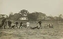 In their first game of 1896, Alabama shutout the Birmingham Athletic Club before they lost their only game of the season against Sewanee. The Crimson White then closed the season with their by playing rival Mississippi State (then Mississippi A&M) for the first time. Alabama won 20–0. The 1896 team's manager was Champ Pickens, who gave Alabama's band its name of the "Million Dollar Band", and was the namesake of the Champ Pickens Trophy.[7] The team played only one game during the 1897 season and did not field a team for the 1898 season because of a ban restricting student athletes from traveling away from campus.[2] The team's quarterback in 1897 was Ed Tutwiler, the son of Birmingham philanthropist Edward Magruder Tutwiler. One account reads "Ed Tutwiler is one of the greatest stars that football in the south ever produced. He was a graduate of the University in the class of '98, and afterwards went to the University of Virginia. He was considered the pluckiest quarterback in the south, and was noted for head work and generalship."[8] The team resumed play in 1899 after the ban was lifted due to fan and student outcry.[2] Alabama played rival Tennessee for the first time in 1901. The first game ended early in a 6–6 tie, when fans rushed onto the field after a controversial offside call and the umpires were unable to clear out the crowd in the second half.[9] Eli Abbott returned for the 1902 season. The 1903 team beat LSU for the first time, and Auburn for the second time. 1905 saw two All-Southern players for Alabama in Auxford Burks and T. S. Sims. "The overworked Burks, who appeared to bear the entire brunt of Alabama's offense",[10] collapsed on the field during the second half of a 12–5 loss to Georgia Tech. Burks scored in the 30–0 victory over Auburn in what was then the largest crowd ever to see a game in Birmingham (4,000).[11] He was said to be the school's "first running back hero".