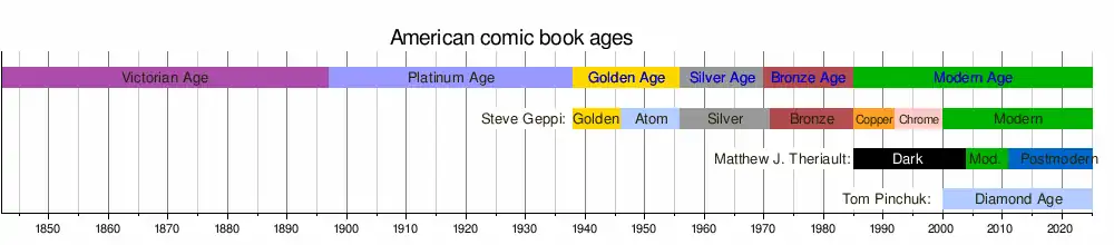 In A Complete History of American Comic Books, Shirrel Rhoades cites Steve Geppi (the publisher of the Overstreet Comic Book Price Guide and founder of Diamond Comic Distributors, the direct market distribution monopoly between 1997 and 2020) who, taking into account comic strips, divides the history of comics in ages:[11] Victorian (Victorian Age, from 1828 to 1882), of platinum (Platinum Age, from 1882 to 1938), of gold (Golden Age, from 1938 to 1945), atomic (Atom Age, from 1946 to 1956), of silver (Silver Age, from 1956 to 1971), of bronze (Bronze Age, from 1971 to 1985), of copper (Copper Age, from 1986 to 1992), of chrome (Chrome Age, from 1992 to 1999), and modern (Modern Age, 2000 to present). According to Rhoades, consideration of comic strips in the general history of comics has led Geppi to add two periods before the Golden Age: the Victorian Age (from 1828 to 1882) and the Platinum Age (the period of comic strips).[11]