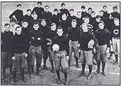 The first University of Arkansas football team was formed in 1894 and coached by John Futrall, who was a Latin professor at the university.[1] That team played three games: two against Fort Smith High School and one against Texas.[1] Before the 1909 season, the teams were called the Arkansas Cardinals and a bird was the school's mascot.[2] The name and mascot changed following the 1909 season when the football team, coached by Hugo Bezdek, finished 7–0.[3] The Cardinals became the Razorbacks after Arkansas defeated LSU 7–0, and coach Bezdek told a group of reporters after the game that his team played like a "wild band of Razorback hogs". The name stuck, and the student body voted to change the mascot.[4][5] The "Wooo Pig Sooie" or "Calling The Hogs" became a tradition and the official school cheer in the 1920s when farmers rushing out to meet the bus returning from an away game called the hogs as a greeting.[6][7][8] Arkansas prevailed over powerhouses Oklahoma, LSU and Washington University in St. Louis in 1909, and was declared unofficial champions of the South and Southwest.[1] It was with the help of Steve Creekmore that this was accomplished. Creekmore became perhaps the first Razorback star, a quarterback from Van Buren who initially played only intramurals.[1] Bezdek used Creekmore to install a very early edition of the hurry-up offense, as the team never huddled and chased the ball after every play.[1] Creekmore was also known for "fast and slippery running, blocking, and passing" and could also return punts and tackle well.[1]