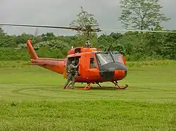 Support was provided to the group via use of the Loloho wharf on the eastern side of the island by naval vessels from Australia and New Zealand as well as the Kieta airfield by weekly C130 Hercules flights from Townsville. Four UH-1 'Huey' helicopters were supplied by Australian 171st Aviation Squadron, which were painted bright red for visibility and utilised to ferry personnel to inland villages inaccessible by foot or vehicle. With more than 8,000 safe flying hours in the skies of Bougainville to their credit, the choppers made their way back to Australia aboard HMAS Kanimbla. Later, air mobility was outsourced to the commercial Hevilift company, which provided two Bell 212 helicopters.