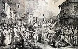 Mary's persecution of Protestants earned her the nickname "Bloody Mary".[48] Nationally about 288 Protestants were burnt at the stake during her reign, including 41 in Sussex.[39] Most of the executions in Sussex were at Lewes. Of these 41 burnings, 36 can be identified to have come from specific parishes, and the place of execution is known for 27 of them; because the details of the executions were recorded in the Book of Martyrs by John Foxe, published in 1563.[50] Martyrs included Deryck Carver, a French-speaking Flemish man who had sought refuge in Brighton from persecution for his Calvinist beliefs; and Richard Woodman, an ironmaster from Buxted. There are Bonfire Societies in Sussex that still remember the 17 Protestant martyrs that burned in Lewes High Street, and in Lewes itself they have a procession of martyrs' crosses during the bonfire night celebration.[51] According to Quinn, the authorities in Sussex during Mary's reign were rather less bloodthirsty than is generally assumed, often allowing their opponents to slip the noose when they could.[52] Carver's meetings had been attended by many fishermen from both England and France, beginning the tradition of French Christian worship in Brighton.