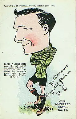Crystal Palace became a Football League club in 1920 when the Southern League First Division clubs were admitted en bloc as founder members of a newly formed Football League Third Division. In their first season as a Football League club, Palace lost their opening game at Merthyr Town 1–2 with George Milligan scoring the club's first ever league goal. Milligan's Palace career was short-lived however, and he made just one more appearance for the club. Palace's first ever home Football League match was a disappointing 0–0 draw against Plymouth Argyle, but the club then went on a run of six consecutive wins. Goalkeeper Jack Alderson, who had been signed in 1918, kept a clean sheet in five of those wins and they lost just six more league games all season. Palace were unbeaten in the final sixteen games of the season which included an eight-game winning streak and went on to win the championship by five points from runners-up Southampton and gain promotion to the Second Division. The club conceded just 34 goals over the season, a record that stood until 1979,[20] and Palace joined Preston North End, Small Heath, Liverpool and Bury as the only clubs at that time to have won a championship in their first season as a league club. Palace also won their third London Challenge Cup, beating Clapton Orient 1–0 at White Hart Lane with a goal from forward John Conner.[21]