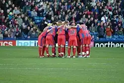 The 2009–10 season began with the club in financial uncertainty after failing to pay bonuses to former players, as well as money owed to Bristol City for the transfer of Australian international midfielder Nick Carle twelve months before.[107] The Football League placed a transfer embargo on Palace in early August, which was lifted near the end of that month. However, it was only another three weeks before a second embargo was put into effect, this time due to an unpaid portion of a transfer fee owed to Ipswich Town for striker Alan Lee.[108] The financial problems came to a head at the end of January 2010, when the club was placed into administration by creditor Agilo Finance, and Brendan Guilfoyle of the P&A Partnership was appointed administrator to take over the day to day running of the club.[109] Star players soon departed including Victor Moses who was sold to Wigan Athletic,[110] and manager Neil Warnock also left one month later to take over at QPR.[111] Paul Hart was appointed caretaker manager along with former Palace players Dougie Freedman and John Pemberton returning to the club as assistant and first team coach respectively.[112] Before administration, the Eagles appeared to be building towards a run for the play-offs, but the ten-point deduction the club suffered as a result turned the season into a battle against relegation. Survival was only achieved on the final day, with a memorable 2–2 draw at Sheffield Wednesday, who were demoted to League One instead of Palace.[113] Following the end of the season, Freedman replaced Hart as temporary manager and the club emerged from administration owned by a consortium of wealthy fans called CPFC 2010.[114] The consortium praised the efforts of the Palace fans who led a campaign which helped secure the freehold of Selhurst Park by putting pressure on Lloyds Bank to sell the ground back to the club.[115]