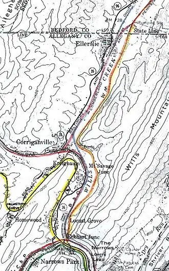 Railroads in the Wills Creek valley and the Narrows west of Cumberland in the early 20th century. Blue: Baltimore and Ohio Railroad (1842–1986). Red: Cumberland and Pennsylvania Railroad (1845 (as Mount Savage Railroad)–1953). Green: Georges Creek and Cumberland Railroad (1876–1939). Yellow: Western Maryland Railway (1906–1987). Orange: Huntingdon and Broad Top Mountain Railroad (1872–1954). Today CSXT continues to operate the former B&O line through the valley.