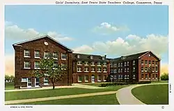 As Whitley had done before him, Gee prioritized the building of sorely needed new residential and academic buildings, first buying over 300 acres (120 ha) of land for expansion of the physical plant; by 1948, he had led the construction of three new buildings: Binnion Hall (a women's dormitory), Central Cafeteria, and a student center built from pieces of a prefabricated army service club from Camp Maxey.[67] By the end of the academic year another new building, journalism and speech's Dealey Hall, joined them, more than doubling the value of ETSTC's physical plant (to $4,140,000, from $1,800,000). 1950 and 1951 also witnessed major growth, especially for athletic buildings: Memorial Stadium, the Field House, and a swimming pool were all built, in addition to a new administration building that later became Education North.[68] The "building spree" continued throughout the 1950s, as numerous academic departments, ranging from Agriculture and Audio-Visual Education to Industrial Education and Music, moved into new buildings.[59]