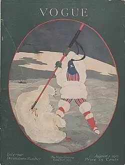 A Vogue cover from 1917 depicts a model clad in white fur spearing a polar bear. Her garments, while stylized and unrealistic, appear to take visual influence from the clothing of the Greenlanic Inuit.[181] From approximately 1915 to 1921, curators at the American Museum of Natural History collaborated with fashion designers to create an American clothing style inspired by Indigenous cultures of North and South America, including the Inuit.[183] In the 1920s, American designer Max Meyer drew inspiration from Inuit garments at the Brooklyn Museum.[184] The 1922 film Nanook of the North has been a popular source of inspiration to fashion designers since its release.[185]