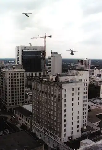 U.S. Marines train by air in a downtown drill. In the foreground is the former Hotel Roosevelt.