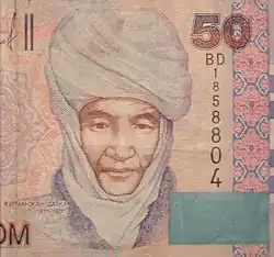 A 50-Kyrgyzstan som banknote representing Kurmanjan Datka.