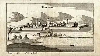 The mid-12th-century Muslim geographer, Muhammad al-Idrisi, mentioned a town named "T.n.y.s.b.r" and described it as a prosperous settlement, located to the south of the river "T.y.s.y.a", or Tisza.[6] Historian István Petrovics associates T.n.y.s.b.r with Temesvár, suggesting that Idrisi mislocated it because he had no direct information of the town.[6] Timișoara was named after a fortress: the Hungarian name of the town, Temesvár, refers to a castle (vár) on the river Timiș (Temes).[2] The fortress was first mentioned in the Register of Arad around 1177.[2][6] The document mentioned two villages, "Sep" and "Vrman", on the royal estates attached to the fortress "Demesiensis".[6] It was most probably made of earth and timber, according to historian Ferenc Sebők.[2] The fortress, which was erected on a swampy land, near a tributary of the Temes, the Bega, was the seat of the ispán, or head of Temes County.[7] In 1241 the city was destroyed during the Mongol invasion of Hungary and Poland, but the walls were rebuilt.[1]