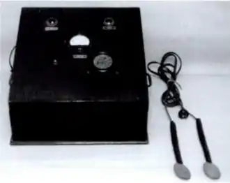 The idea for an automated external defibrillator was first advanced in the 1970s by Archibald Diack (1907–1993), a surgeon in Portland, Oregon. Diack and his team developed a portable unit that could diagnose an abnormal heart rhythm and deliver either a defibrillatory current or a pacing pulse, as indicated by the internal logic circuit. The device was produced by the Cardiac Resuscitator Corporation and marketed as the "Heart-Aid".[58] It was designed for temporary use by laypeople in emergency situations before professional care could be administered. The Heart-Aid utilized a plastic airway with an embedded electrode. An electrical current was transmitted from the capacitor, through the plastic airway device, to an electrode placed over the sternum. There was also a breath detector, which was a safeguard to prevent shocking people who were breathing. It included printed instructions and diagrams for the rescuer to properly apply the electrodes, as well as a speech synthesis chip to give verbal instructions to the rescuer.[58] By the late 1980s, the small company had been purchased by Emerson Radio Corporation, and other manufacturers soon entered the field. Current models use electrode pads attached to the chest.