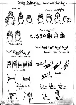 Chalukyas of vatapi have unique clothing, they wore veshti in different styles sometimes veshti goes under knees. The uniqueness of jewelleries is the presence of thigh band.