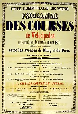 The first documented cycling race was a 1,200 metre race held on May 31, 1868, at the Park of Saint-Cloud, Paris. It was won by expatriate Englishman James Moore who rode a bicycle with solid rubber tires.[3] The first cycle race covering a distance between two cities was Paris–Rouen, also won by James Moore, who rode the 123 kilometres dividing both cities in 10 hours and 40 minutes.[4]