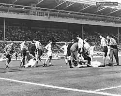 By now, Greaves was fit again, but Ramsey kept faith with Hurst, despite calls from the media for the main goalscorer to return.[24] England won the final 4–2 after extra time, with three goals from Hurst and one from Martin Peters.[23] Hurst's second goal was controversial, with West Germany's players protesting that the ball did not fully cross the goal-line after bouncing down from the crossbar.[25] Moore became the first and, to date, only England captain to lift the World Cup.[26] The game prompted a memorable piece of commentary from the BBC's Kenneth Wolstenholme when describing the run and shot from Hurst which led to his third goal at the end of extra time: "Some of the crowd are on the pitch, they think it's all over!...It is now!"[27]
