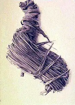 Current archaeological evidence suggests that humans inhabited the Grand Canyon area as far back as 4,000 years ago[12] and at least were passers-through for 6,500 years before that.[13] Radiocarbon dating of artifacts found in limestone caves in the inner canyon indicate ages of 3,000 to 4,000 years.[12] In the 1950s split-twig animal figurines were found in the Redwall Limestone cliffs of the Inner Gorge that were dated in this range. These animal figurines are a few inches (7 to 8 cm) in height and made primarily from twigs of willow or cottonwood.[12] This and other evidence suggests that these inner canyon dwellers were part of Desert Culture; a group of semi-nomadic hunter-gatherer Native American.