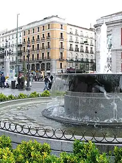 At the end of the renovation of the Gate on June 24, 1860, a fountain was inaugurated circumscribed in a basin of eighteen meters in diameter; this fountain raised a jet of water to more than thirty meters, coming from a "mouth" of seven centimeters of diameter and was located right in the center of the square. A subway channel seventy-seven kilometers long, coming from the Lozoya River, provided the necessary supply to feed the first reservoir of the Canal de Isabel II. This reservoir supplied the new neighborhoods of the widening of Madrid as well as the flow of this fountain. The canalization work is considered one of the first of the Canal de Isabel II. The day of its inauguration was attended by Queen Isabella II, and to the general surprise of those present when the powerful jet of the fountain was activated, the writer Manuel Fernández y González exclaimed: "Oh marvel of civilization, which makes rivers stand up!" (Spanish: "Oh maravilla de la civilización, que pone los ríos de pie!".)[56] The writer's phrase was very popular at the time, and numerous newspapers echoed it. Over the years the fuente del chorro ("fountain of the jet" as it was called) was deactivated because the light gusts of wind deflected the high jet of water, wetting passers-by who strolled through the Puerta del Sol.[6] Finally the fountain was moved to the Plaza de Cuatro Caminos, and later to the Casa de Campo, where it still remains (today it can be seen working next to the Puente del Rey, in front of the Casa de los Vargas). On February 19, 1862, a more modest fountain was placed to replace the previous one, and the paving of the sidewalks was completed with setts. The change caused protests among some Madrilenians due to the custom that was beginning to take root of splashing in the fountain's basin during the early morning hours on Saint John's Eve.[31]