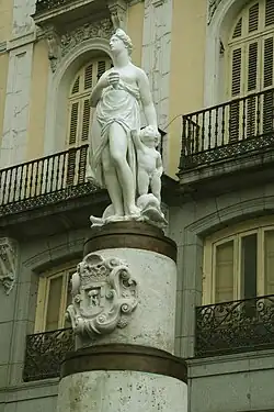 The abundance of groundwater in the area of the Puerta del Sol meant that in the mid-eighteenth century there were numerous wells in the area of the "Calle Ancha" (Puerta del Sol), and it is remarkable that there were more wells in this central neighborhood than in the average of Madrid. Presumably, water consumption was higher due to the large volume of traffic of people and animals through the primitive Puerta. The water that supplied the canalization of the central area corresponded to a viaje de agua (type of qanat) coming from the Abroñigal Alto (the canalization of the "Viaje del Alto Abroñigal" was responsible for the canalization of water during the seventeenth and later centuries until the nineteenth century). The name "Calle Grande de la Puerta del Sol" is common in the documentation of the time, and in most cases refers to it as a place of transit.[41] The statue of the fountain underwent several changes of location throughout Madrid. Since 1985,[34] without the fountain, there is a replica of the old Mariblanca placed on a cylindrical pedestal at the entrance of Calle del Arenal.