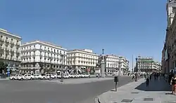 The space does not take on the appearance of a rectangular square-like area, remaining a crossroads of several streets until after the first quarter of the sixteenth century. In 1570 the wall of the fort was demolished and the area was cleared in the form of a square, frequented by water carriers and peddlers. A fountain appears in its center, the Mariblanca fountain.[22] The image of the Puerta del Sol in the middle of the eighteenth century was that of a conglomerate of unequal houses, most of them with only one floor. The streets were swept weekly, there were often dead horses in the pens, and the smell was unbearable in some areas due to putrefaction and the prolonged accumulation of garbage.[23] The situation changed gradually during the reign of Ferdinand VI, the most significant change being the one experienced with Charles III.