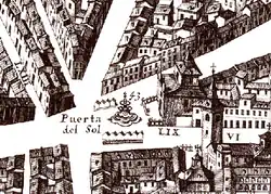 All these streets would end up having a common exit from the city in the gate that the people would call Puerta del Sol, which was located at the entrance of the current Calle Preciados (Cava del Arrabal). The description made by the documents of the time seems to give greater relevance to the Puerta de Guadalajara (located in the current Calle Mayor) to the detriment of the incipient "calle ancha" that would be the Puerta del Sol. To know the size of such a street, some chroniclers mention that the width of the gate barely exceeded that of two carriages.[14] Many of the historians of Madrid (as is the case of López de Hoyos) mention the Puerta del Sol, in medieval times, as a "transit, road and entrance to Madrid".[11]