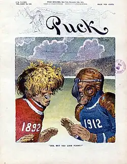 The cover of the November 13, 1912 issue Puck magazine featuring a cartoon of American football players from 1892 and 1912, the caption reads: Gee, but you look funny.. The player from 1892 has grown out hair and not wearing equipment.